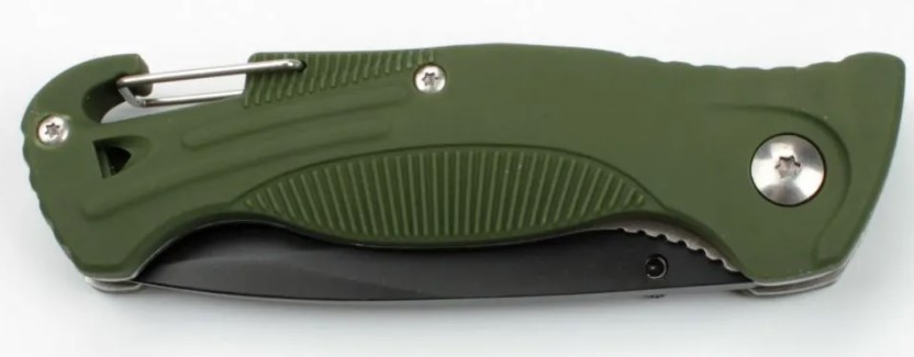 Ручка эргономичной формы отлично ложится в руку. Она сделана из прочного пластика черного цвета. Интегрированный в ручку свисток выделяет эту модель среди других. Этот дополнительный аксессуар может стать незаменимым в экстремальных ситуациях. Не менее полезным будет карабин, имеющийся на ручке. С его помощью нож легко крепится к поясу или снаряжению, и также легко отстегивается. Модель G611 green будет очень полезна для туристов и рыболовов.