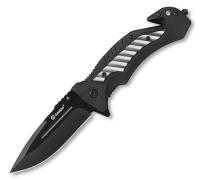 Клинок модели выполнен из высококачественной нержавеющей стали стали 8CR14 с твердостью ±55 HRC. Благодаря содержанию хрома сплав известен своей прочностью, устойчивостью к коррозии и легкостью в затачивании. Профиль клинка типа Drop Point и прямая заточка обеспечивают отличные режущие характеристики и универсальность применения. Рукоять изготовлена из полипропилена (PP) и алюминия, что придает ей прочность и легкость. Полипропилен хорошо сопротивляется влаге, высоким температурам, коррозии и слабым щелочным и кислотным растворам. В рукоять также интегрированы стропорез и стеклобой, которые могут пригодиться в экстремальных ситуациях. Модель может похвастаться не только стильным внешним видом, но и функциональностью и практичностью