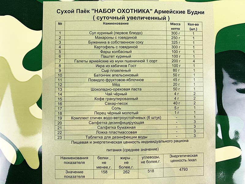 У нас большой выбор сухих пайков от разового приема пищи до суточных. Набор упакован в непромокаемый пакет. На пакете есть наклейка с содержимым пайка, пищевой и энергетической ценностью. Срок годности пайка 2 года.