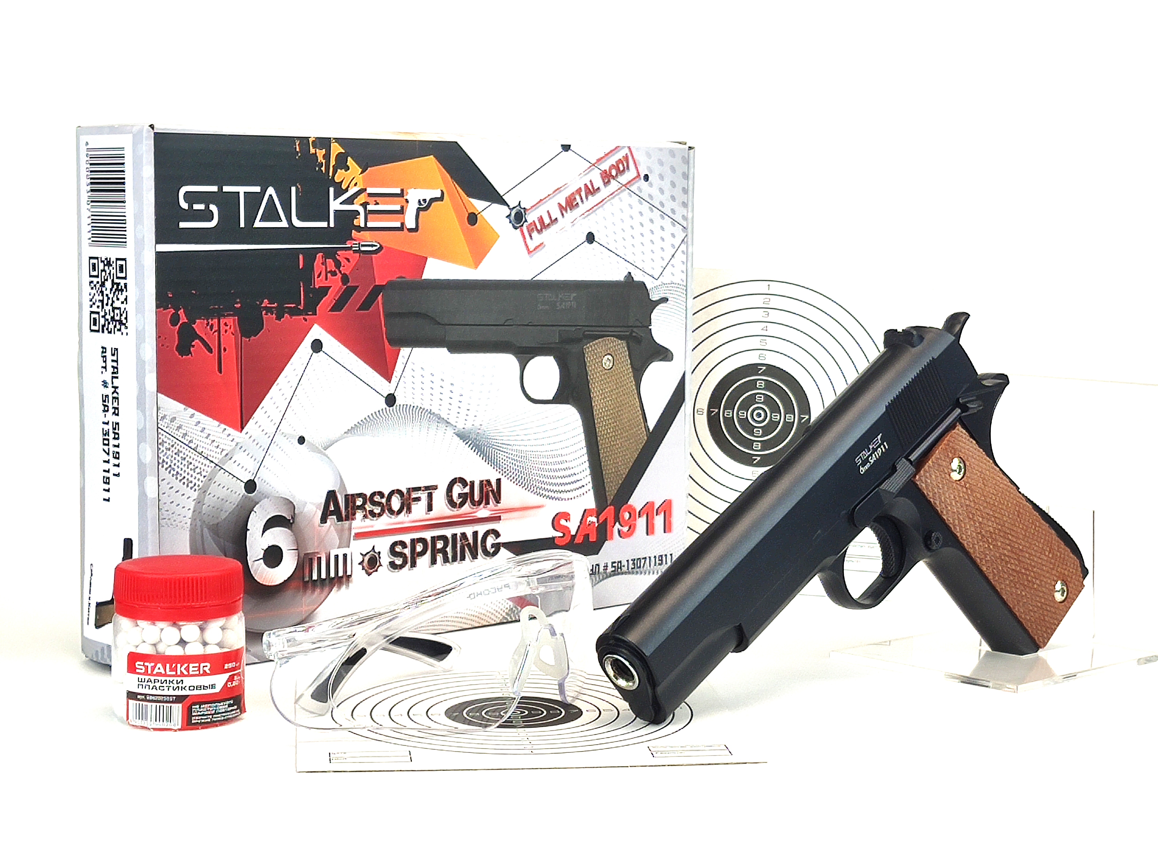Пружинно-поршневой пистолет Stalker модели SA19 Spring предназначен для игры в страйкбол, развлекательной и тренировочной стрельбы. Пистолет, благодаря простоте эксплуатации и легкости, подойдет даже для детей. стрельба из пистолета ведется пластиковыми шариками диаметра 6 мм, которые загружаются в отъемный магазин в количестве 12 штук. Корпус пистолета изготовлен из сплава металла; накладки на рукояти - полимер. В комплект Пистолет страйкбольный Stalker SA1911 Spring (Colt1911) 6мм входит: Пистолет пневматический Stalker SA1911 Spring (аналог Colt1911) 6мм, мет.корпус Шарики пластиковые 6мм  250 шт Очки стрелковые Мишени 5 шт